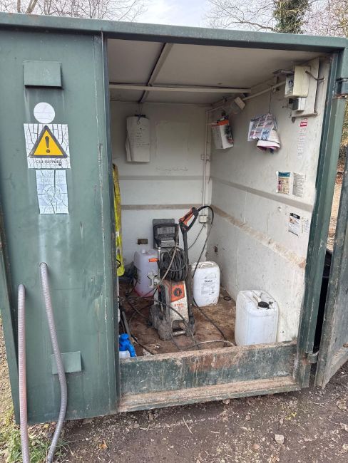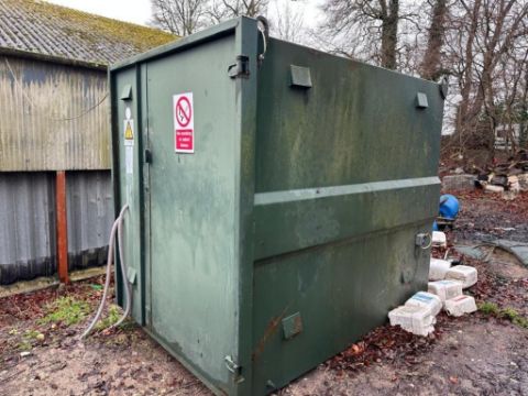 Spray cabinet. Purpose built. Bunded. C/w fitted electric heater & shelves. 1.8m x 2.45m