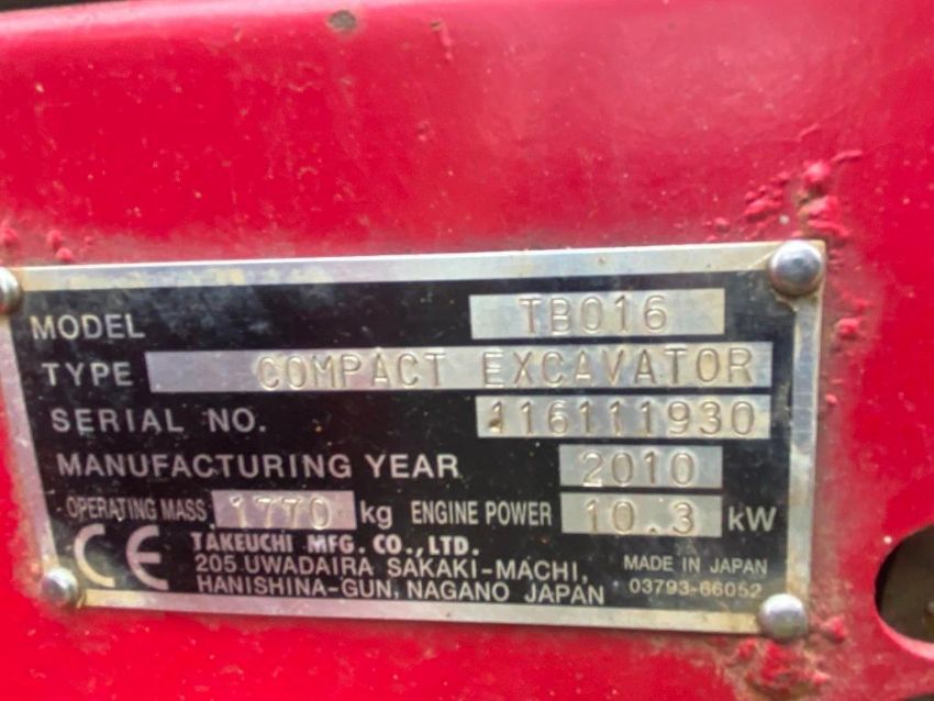 Takeuchi TB016 Mini Digger, c/w 3No. Buckets