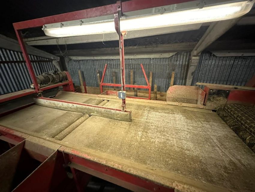 Tong Caretaker 1200 grader system c/w intake hopper, 6 rows of 6 finger stars with 900mm wide soil conveyor underneath. 4ft wide sizing screen fitted with 30mm metal screen, 900mm wide reject conveyor underneath, transferring to 4 person picking table with trash chutes and 450mm wide trash conveyor. Lights and control box for grader in picking area. Single axle road tyres for movement assorted 30mm, 40mm and 50mm supplied loose, 3 phase electrics. Serial no. 956657