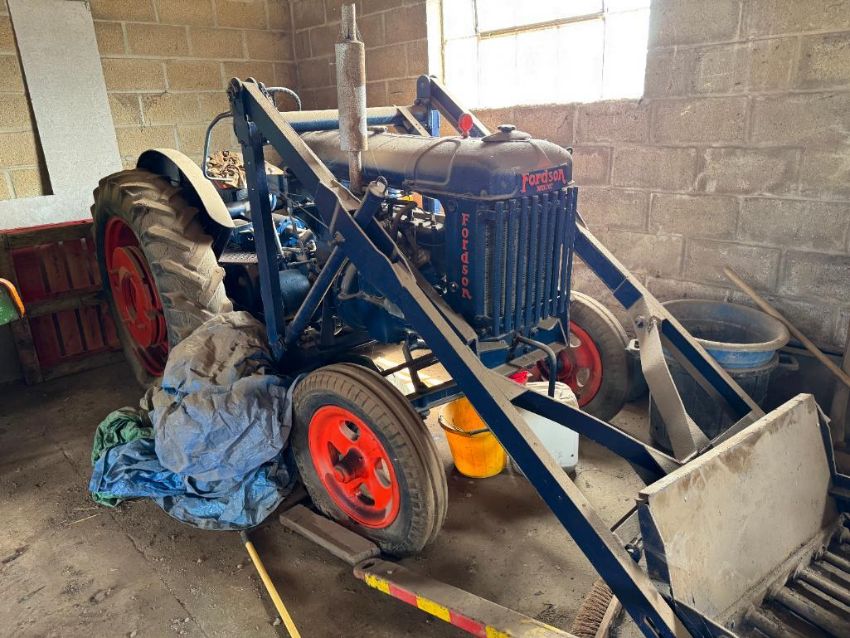 Fordson Major E27N 2wd tractor, petrol paraffin with fore end loader, side belt pulley and swinging drawbar on 6.00-15 front and 11-36 rear wheels and tyres. Reg: 484 XUG