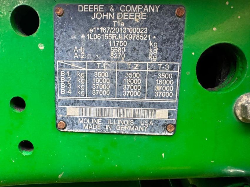 2021 John Deere 6155R AutoQuad 40kph 4wd tractor with front linkage and PTO, TLS front suspension, cab suspension, 4No manual spools and Power Beyond, air brakes, ISOBUS, LED light package and AutoTrac ready on Vredestein 540/65R28 front and 650/65R38 rear wheels and tyres. Datatag registered. Reg No: CU21 ZPV. Hours: 8,852. Serial No: 1LO6155RJLK978521. NB: Manual in Office