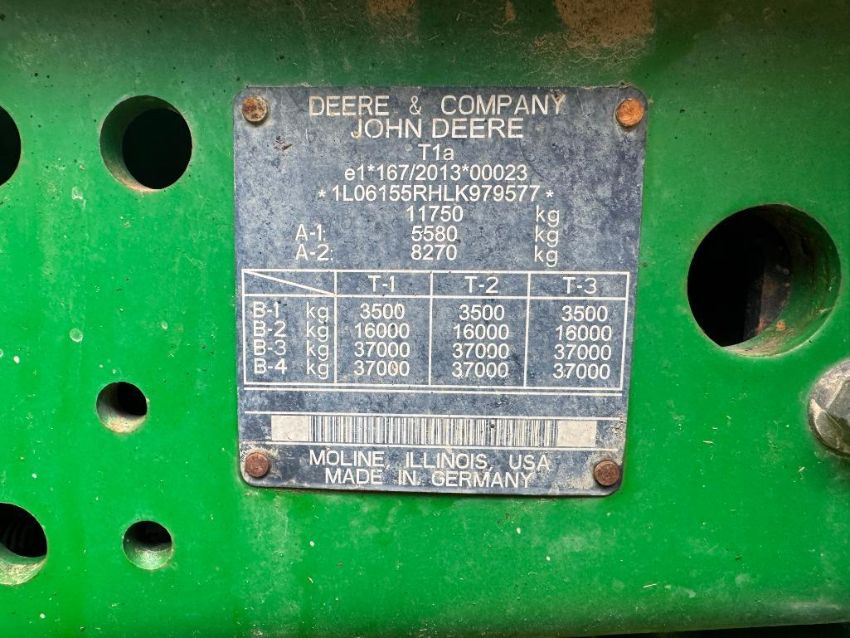 2021 John Deere 6155R AutoQuad 40kph 4wd tractor with front linkage and PTO, TLS front suspension, cab suspension, 4No manual spools and Power Beyond, air brakes, ISOBUS, LED light package and AutoTrac ready on Vredestein 540/65R28 front and 650/65R38 rear wheels and tyres. Datatag registered. Reg No: CU21 ZPW. Hours: 6,832. Serial No: 1LO6155RHLK979577. NB: Manual in Office