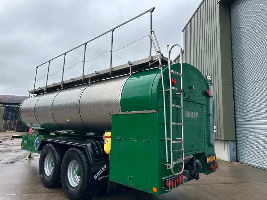 2016 Bailey 17,000l stainless steel double skinned spray mixing bowser, 2No compartments 12,000l baffled tank / 5,000l tank, with comprehensive pumping system, 1,000l per min Honda pump, 3” pipework throughout, rinse nozzles in the roof of both tanks, twin dry sight gauges, slide out fast fill induction hopper, front platform for IBC’s, storage lockers on each side, rear ladder, walkway and safety rail, air brakes, sprung drawbar and axles, twin axle on Michelin 560/60R22.5 wheels and tyres. Serial No: 14830-16T